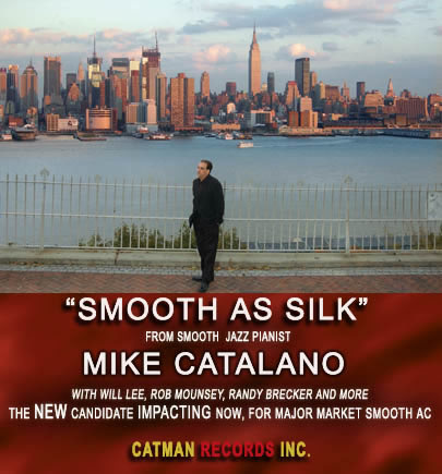 New to Smooth Jazz, but not new to the music Industry veteran PIANIST COMPOSER Mike Catalano brings you his Debut SMOOTH JAZZ CD, A Manhattan Affair, straight from the shores of the Hudson River! It’s smooth jazz straight from where no man has gone before.(lately)..the streets of Manhattan! Mike’s music became familiar to millions of Americans via his memorable compositions, and his tasteful touch on the piano, broadcast Nationwide nightly on Fox TV’s A Current Affair with Maury Povich, The Reporters, Good Day New York, and many other shows for Fox TV in New York. Now he celebrates his entry into the pop world with his smooth jazz CD, featuring 9 brand new fresh catchy exciting compositions, and 3 breath-taking original arrangements of cover tunes. His long time dream of making a smooth jazz album is finally come true and he's invited the best of the best to participate! 13 New FRESH TRACKS Featuring Mike's piano: Highlights include: -the new single Smooth as Silk puts you flying over the city with Mike's piano, and a sensual trumpet solo by all time legendary Grammy winner Randy Brecker and an action packed band! -Bob James with 2 Special Guest appearances by on Rhodes duet style with Mike's acoustic piano on Disney's Beauty and the Beast, with eloquent soprano Saxophone of Blue Lou Marini (of SNL and BLUES BROTHERS FAME) and the magical "Moonlight in Baja" track. -Will Lee singing "Fool on the Hill", dueting with Mike's piano -Ivan Lins-singing the Jobim tune Dindi in ENGLISH and PORTUGUESE,, -Rob Mounsey's amazing Orchestrations and featured part on Mr.Swing, and more more cool moments! - liner notes by New York Legendary Journalist Steve Dunleavy! (NY POST LEGEND, BEST SELLING AUTHOR, TV LEGEND) -Tasteful sensual guitars of Jeff Mironov, Chuck Loeb and Ricardo Silveira! -Pristine digital sound, mixed by Ken Freeman (of Fourplay, Bob James) and mastered by Greg Calby, Sterling sound NYC. -Liner Notes by NY Post Journalistic Legend- Steve Dunleavy