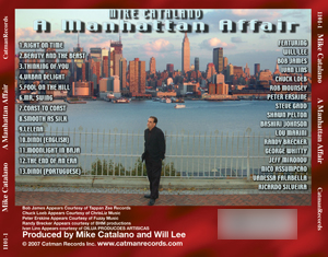 Mike Catalano, A Manhattan Affair, Produced by Mike and bassist Will Lee (Late Show with David Letterman, The Fab Faux), and it features a variety of new smooth jazz hits by piano meistro Mike Catalano and a great lineup of musicians, pioneers and industry legends with Mike, Special Guests includes a WHO's WHO of the smooth jazz industry...Will Lee, Rob Mounsey, Bob James, Ivan Lins, Chuck Loeb, Lou (Blue Lou) Marini, Steve Gadd, Peter Erskine, Shawn Pelton, Ricardo Silveira, Bashiri Johnson, Jeff Mironov, George Whitty, Mark Egan, Nico Assumpcao, Randy Brecker. Liner notes by Steve Dunleavy of the New York Post, written Exclusivly for Catman Records Inc. Matt Collar of allmusic.com SAID "These are refreshing, often lushly arranged and endlessly melodic cuts that make the most of Catalano's tasteful keyboard chops.